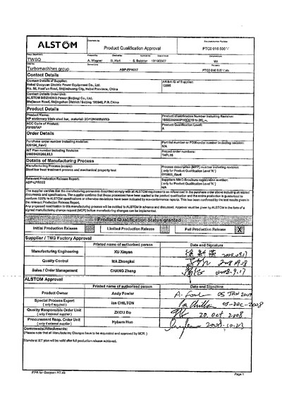 阿爾斯通ALSTOM汽缸螺栓A級認(rèn)證證書